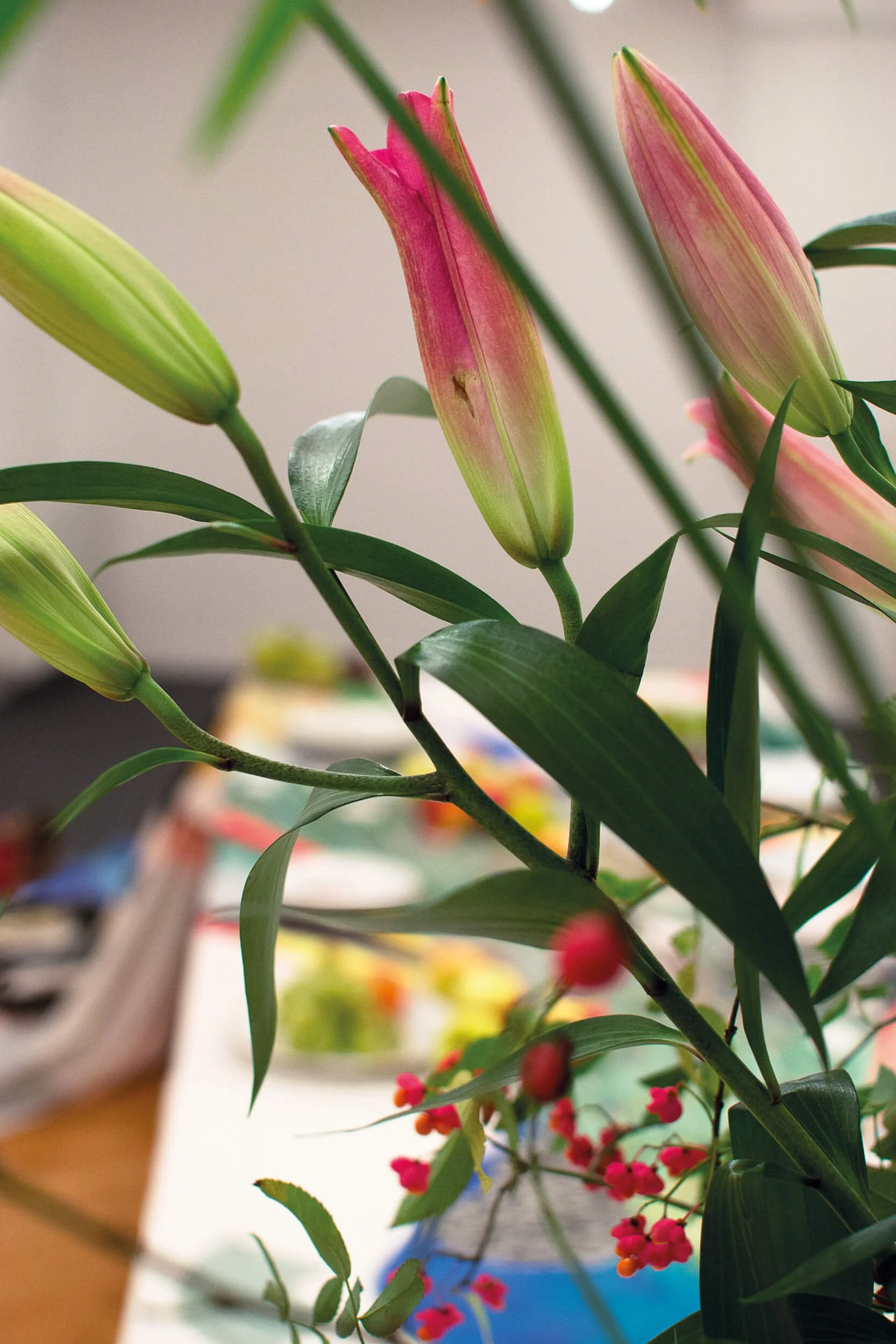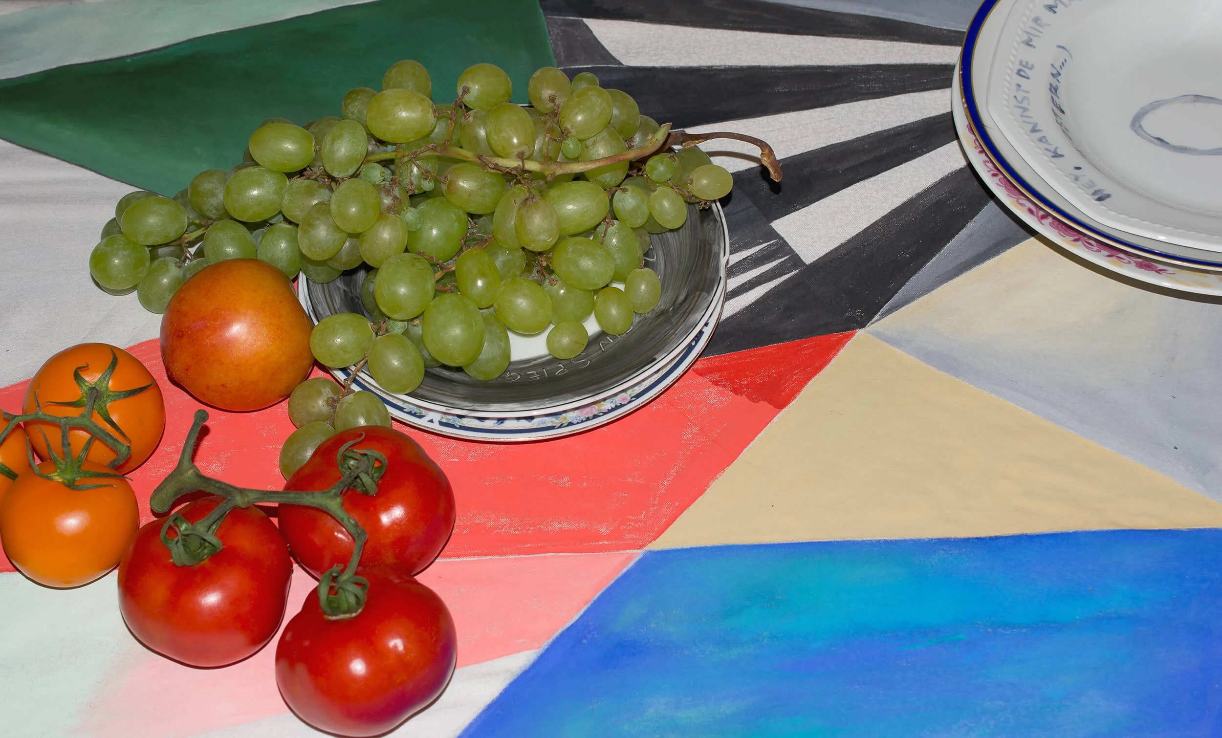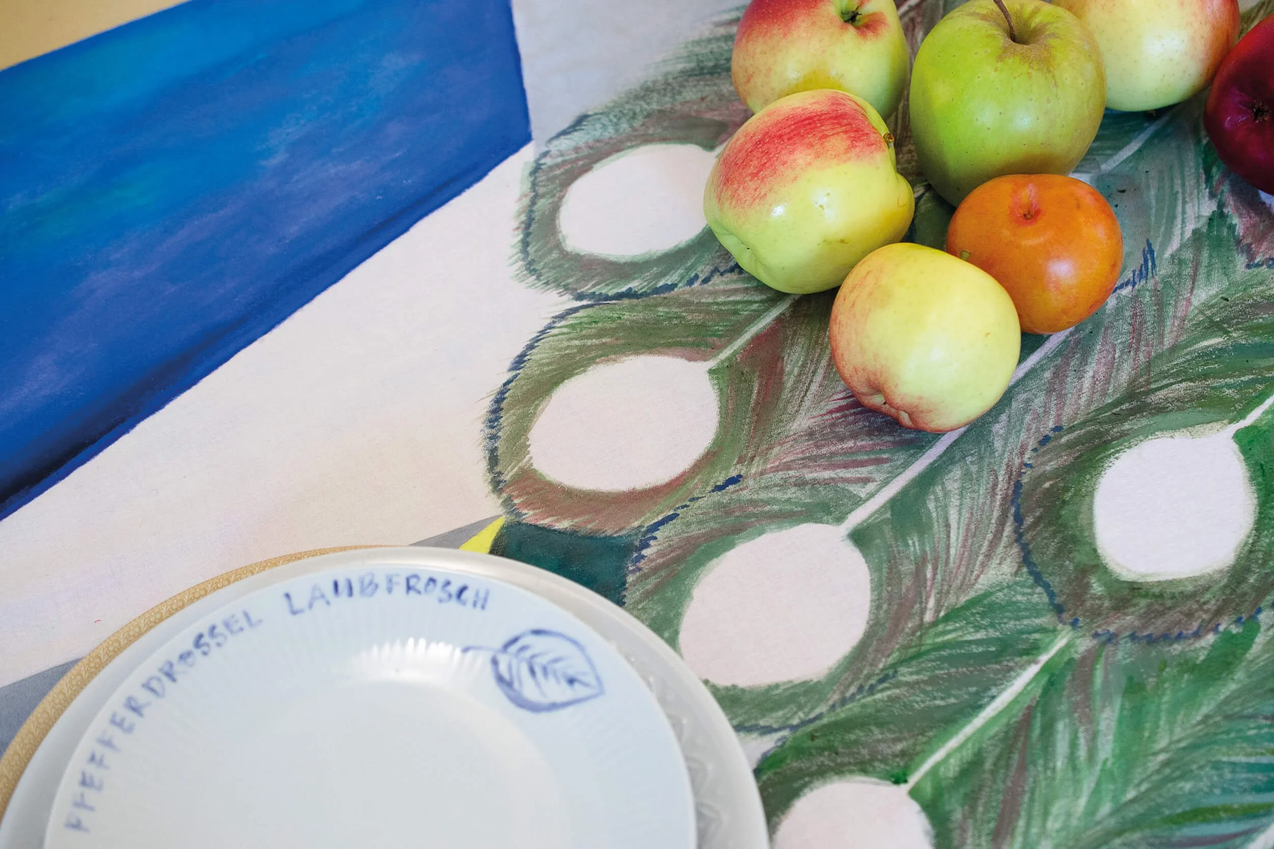 In einer Kollaboration mit der Künstlerin Julia Sinner entstand 2014 ein großformatiges Gemälde eines Pfaus, dessen prachtvoller Schwanz sich nach und nach in geometrische Farbflächen auflöst. Ursprünglich als Tischdecke für eine gemeinsame Performance genutzt, wurde dieses Bild 2020 zum ersten FensterStück: In unserer frisch bezogenen Wohnung verwandelte sich das Performance-Objekt in einen einzigartigen Vorhang, der seither die großen Altbaufenster schmückt und dem Raum in eine ganz eigene Atmosphäre verleiht.