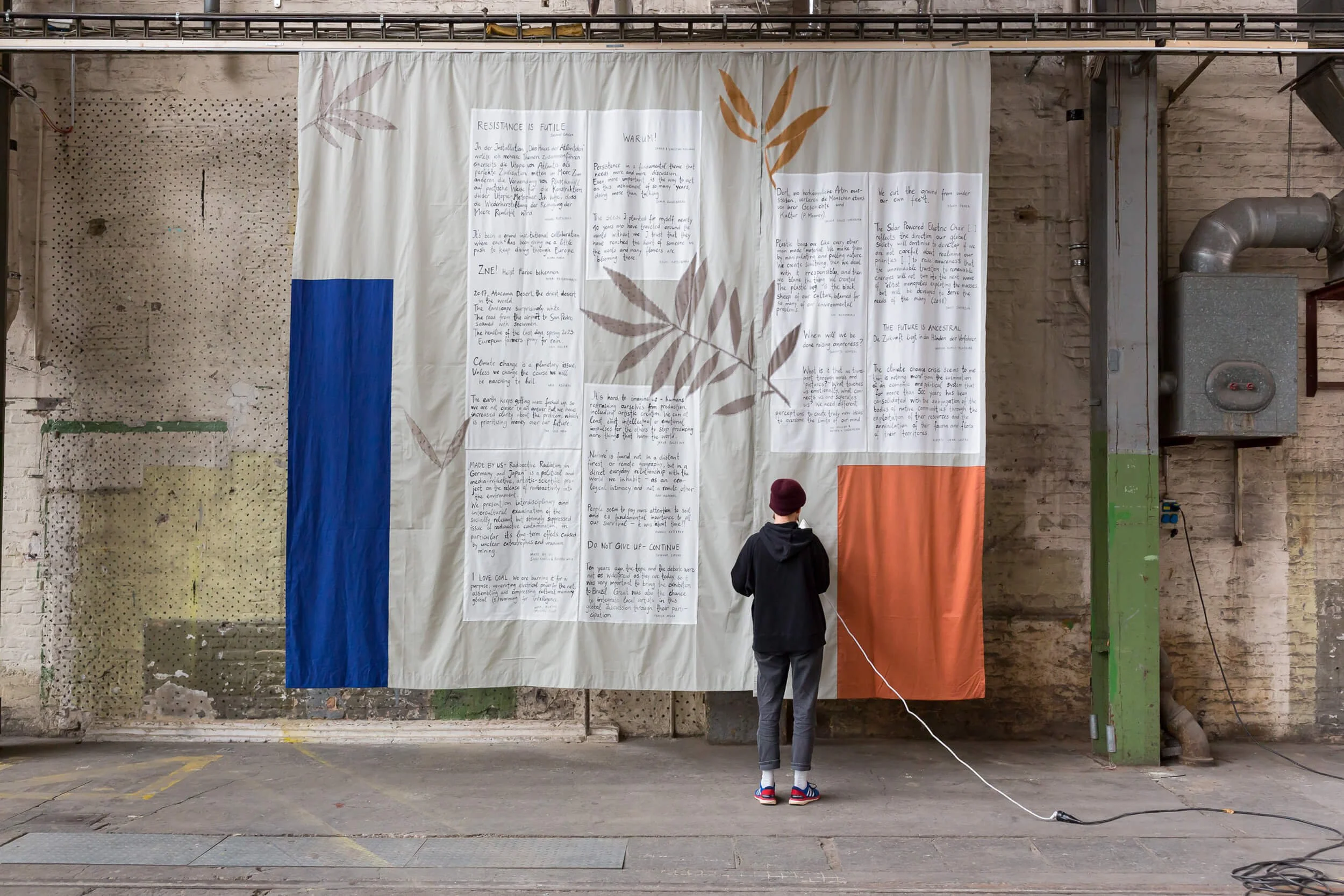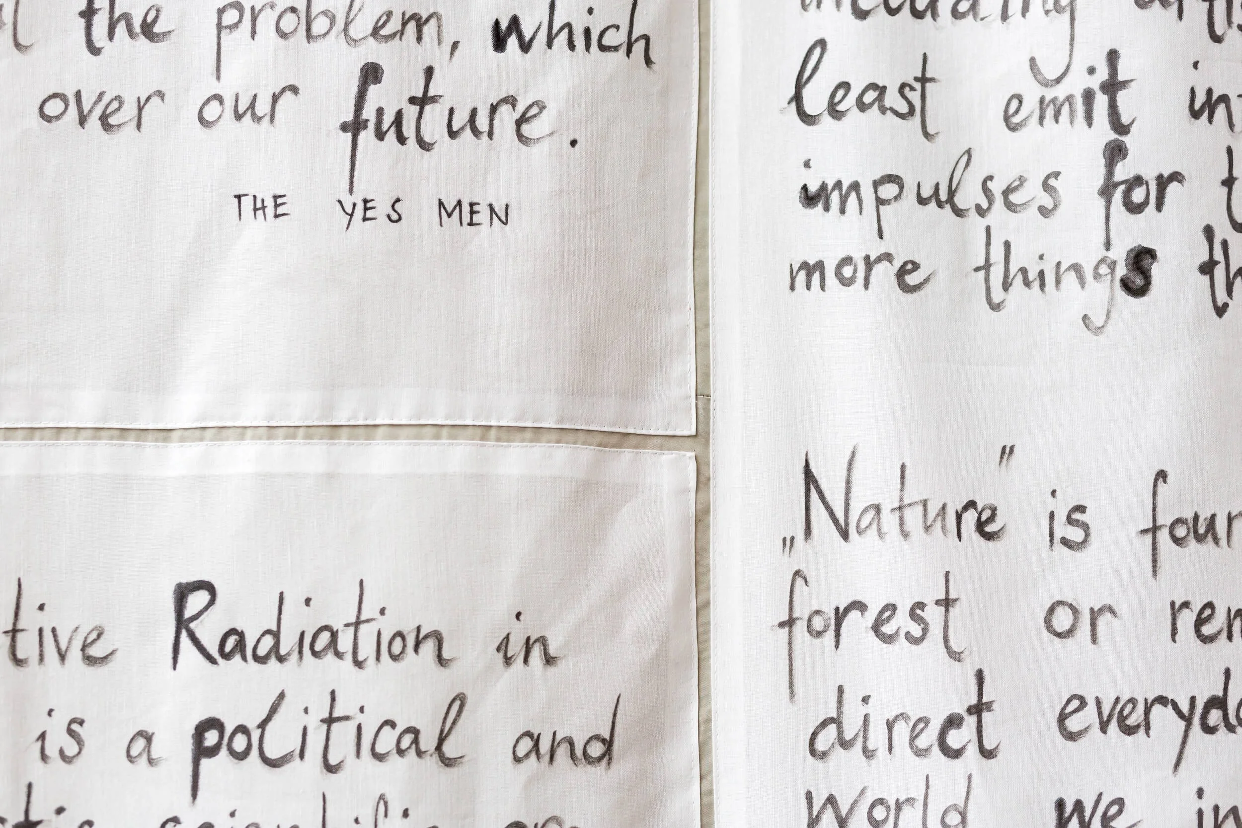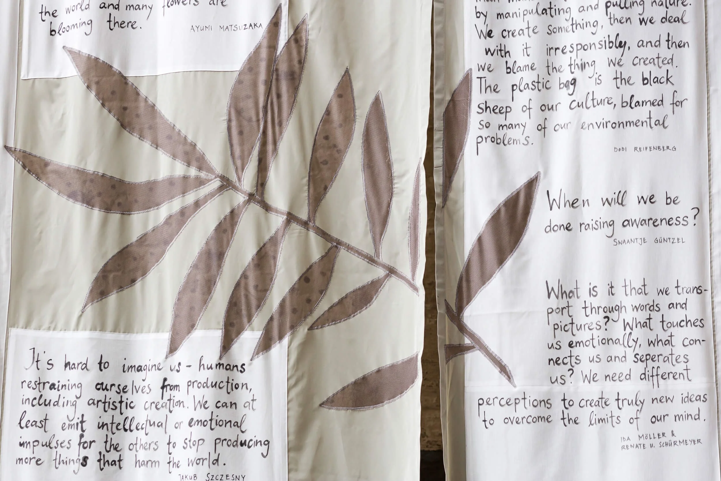 Bringing the harvest and the questions home ist zugleich Untertitel der Ausstellung und Titel meiner Arbeit, für die Statements aller Künstler:innen gesammelt wurden, die je Teil von ZUR NACHAHMUNG EMPFOHLEN! sind und waren. In einer textilen Installation kommen all diese Aussagen zusammen, bilden so zu sagen das gedanklichen Netzes was sich um die weit gereiste Ausstellung spannt. Eine Kollaboration mit den Gedanken so vieler Künstler*innen aus den unterschiedlichsten Ländern dieser Welt, ist neu für mich. Neu auch der Umgang mit Text in meiner Arbeit, und findet doch seine Entsprechung darin, wie ich mit Stoff umgehe: Stück für Stück wird zusammengesetzt, bis sich aus den einzelnen Teilen ein neues Ganzes ergibt.